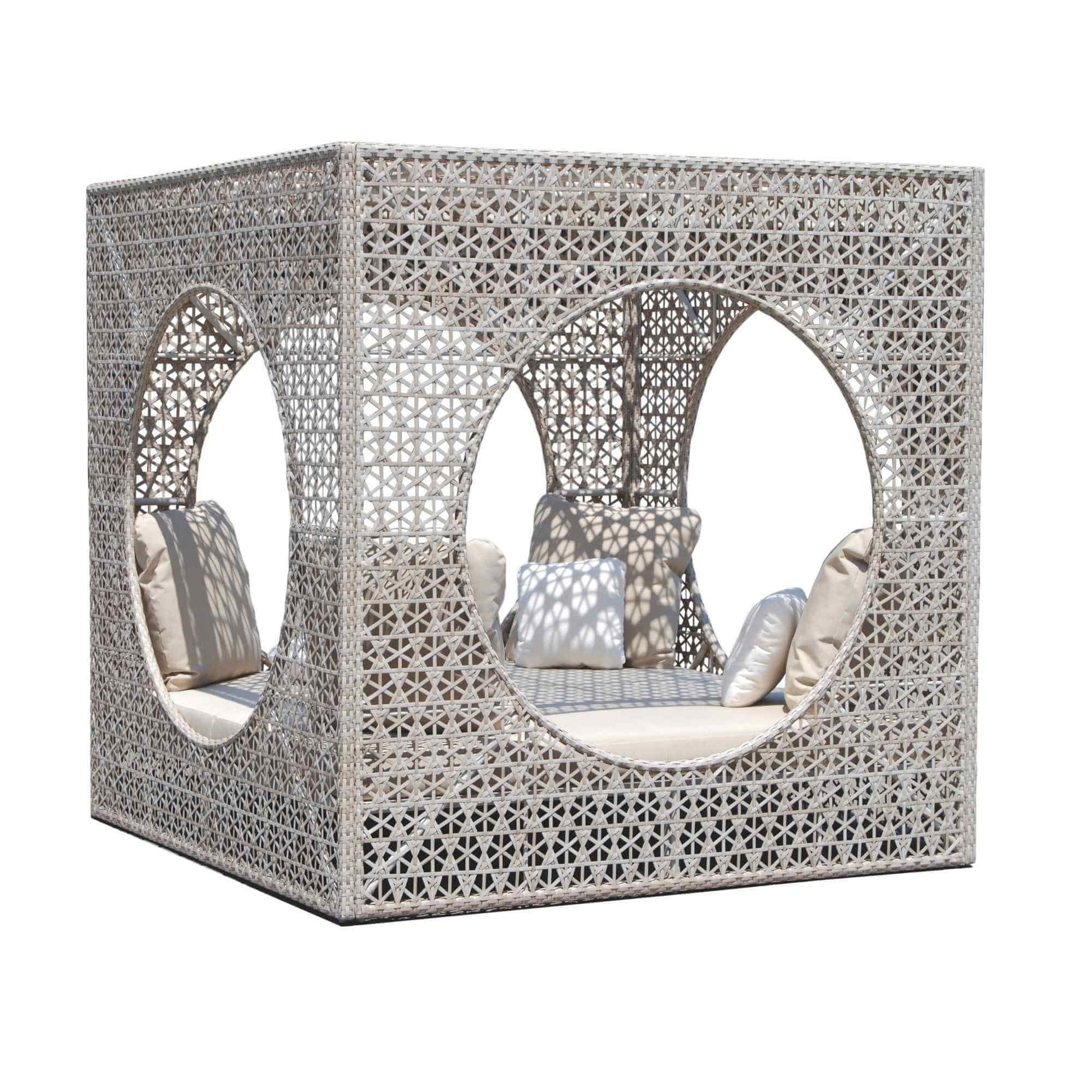 The Cube Daybed offers a private sanctuary for relaxation with its distinctive geometric design. Constructed with a durable aluminum frame and wrapped in handwoven synthetic fiber, this daybed is both stylish and weather-resistant. The circular cutouts create a unique open-air feel while maintaining an intimate lounging experience. The plush Sunbrella cushions ensure superior comfort and long-lasting performance, making it perfect for luxurious outdoor retreats. Available in a Seashell finish, this statement piece is ideal for poolside lounges, resorts, and high-end residential spaces.